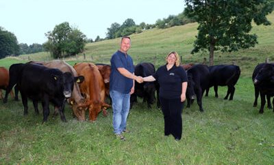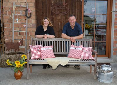 Frau Weinle beim Besuch auf dem Falkenhof mit Herrn Renz und vielen Vierbeinern.