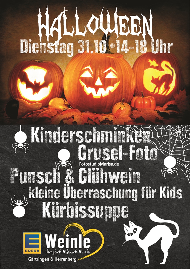 Am Dienstag 31.10 von 14-18 Uhr ist im Edeka Weinle in Herrenberg und GĂ€rtringen Halloween zum Gruseln! Ihr könnt euch professionell schminken lassen. Danach ein Gruselfoto schieĂen lassen und es mit nach Hause nehmen. FĂŒr alle Kids gibt es noch eine kleine Ăberraschung.