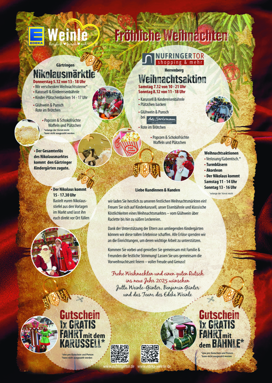 Wir laden Sie herzlich ein, die festliche Atmosphäre auf unseren Weihnachtsmärkten in Gärtringen am 5. Dezember und Herrenberg am 7. und 8. Dezember zu genießen.